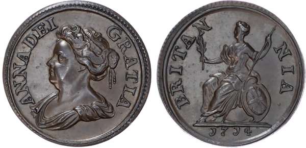 Struck in copper on a small flan 21mm, dies 2 + E, draped bust facing left, legend reads ANNA DEI – GRATIA. Rev, Britannia seated left on globe, legend reads BRITAN-NIA, edge plain, date in double lined exergue (S.3625; BMC 741). Good extremely fine.