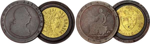 George III (1760-1820), AE ‘Cartwheel’ Penny, 1797, screw turned into a novelty box, and imitation guinea [2].