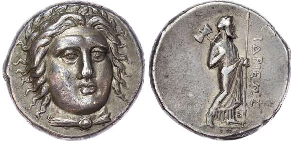 Head of Apollo facing. Rev. ΙΔΡΙΕΩΣ, Zeus Labraundos standing right, holding lotus-tipped sceptre and double-axe. (SNG VA 8046; SNG Keckman 278; BMC 183). Extremely Fine.