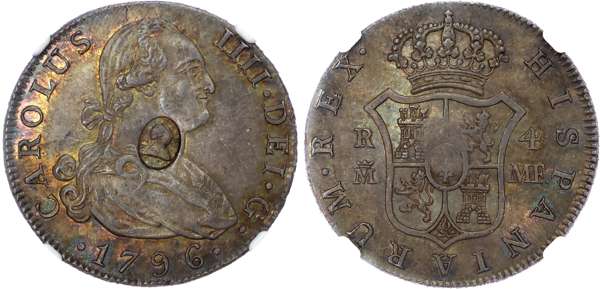 1796-MF, Madrid mint. Draped bust right, countermark of George III within oval at neck, Rev., Crowned shield of arms, mintmark and master at either side, 12h. (Bull 1893; S. 3767). Graded and encapsulated by NGC as AU 58+. Conservatively graded in our opinion.
