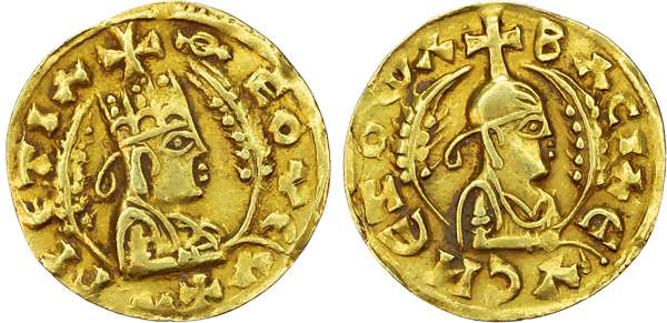 +QEOVC EVXLPICTIL, crowned and draped bust right, holding branch, framed by grain ears. Rev: +BACIL-EVC NEZOwL, draped bust right, wearing headcloth, holding branch, framed by two grain ears. (M-Hay Type 82; cf. BMC Aksum 401). Extremely Fine. Extremely Rare.