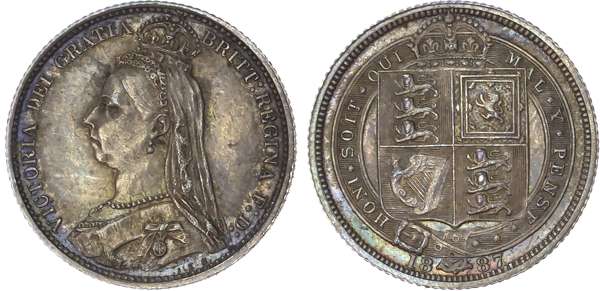 First 1887, withdrawn type. Jubilee bust left, JEB below truncation, Rev., Crowned shield, garter surrounding, 2.81g/12h. (Bull 3269; ESC -; S. 3928), second 1887, crowned value type. Jubilee bust left, Rev., Crowned denomination, wreath surrounding, 2.84g/12h. (Bull 3272; ESC 1754; S. 3929). Good Extremely Fine, deep toning, second Good Extremely Fine or better, attractive blue toning [2].