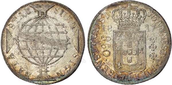 Brazil, João VI (1799-1818, as Prince Regent), silver 960 Réis, 1817 B, Bahia mint, 26.75g (KM 307.1). Very Fine, bagmarks. Overstruck on an earlier type, a clear under type of 8 Reales visible. Scarce mint for this year.