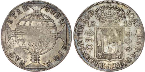 Brazil, João VI (1799-1818, as Prince Regent), silver 960 Réis, 1818 R, Rio de Janeiro, mintmark indiscernible, 26.44g (KM 307.3). About Very Fine. Overstruck on an earlier type. Last year of Regency.
