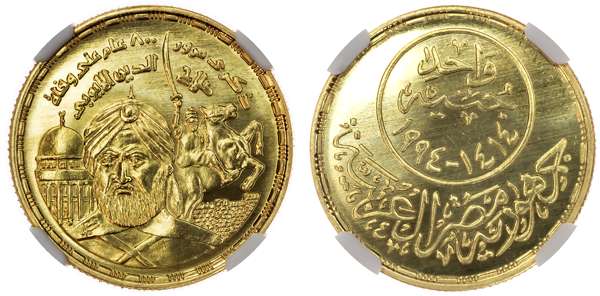 Egypt, Republic, gold Pound, 800th Anniversary of Death of Salah el Din el-Ayubi (Saladin), AH 1414 / 1994 AD, Egypt Mint Authority Cairo, 8.00g (KM 762; MHC 1252). In NGC holder graded MS 69 (8464826-019). The joint finest known in the NGC census with only one other coin. Only six examples are recorded in the NGC census. The overall mintage of this coin was 300 pieces, however according to sources, 246 have been melted with only 54 thought to have remained. None have been recorded on Coin Archives thus far. This is the first example we have ever handled.