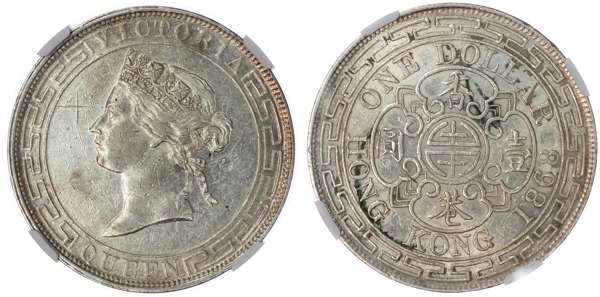 Hong Kong, Victoria (1837-1901), silver Dollar, 1868 (KM 10; Prid. 1). In NGC holder graded AU Details – Obverse Graffiti (8222231-003).