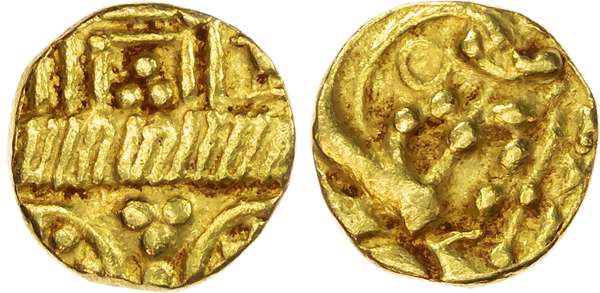 India, Chalukyas of Kalyani, gold Gadyana, anonymous issue, c. 11th – 12th century, a stylized representation of a temple 'Chariot' (Ratha). Rev. Ornate floral scroll enveloping a trident (Vajra-danda) and a wheel, 3.92g (Mitch. 271). Very Fine, rare type, traces of red pigment to surfaces.