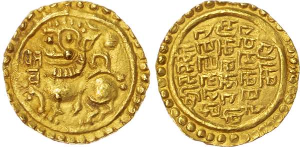 India, Kadambas of Goa, Jayakesin III (1186-1216 AD), gold Gadyana, bilingual (Kannada and Devanagari), mythical lion (Sardula) with a raised forepaw facing left, sun and crescent above rump, name of cyclic year Vibhava. Rev. Devanagari legend in five lines, 4.40g (Mitch. South I 241). Extremely Fine and extremely rare.