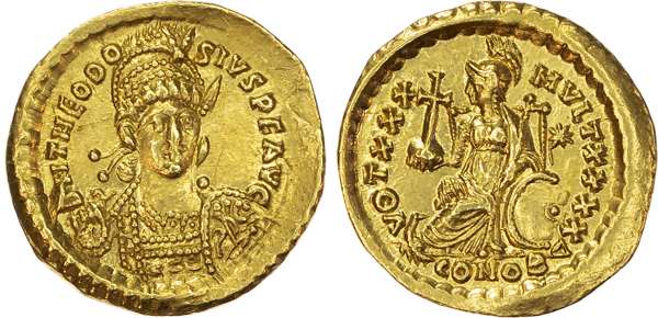 DN THEODO-SIVS P F AVG, diademed, helmeted and cuirassed bust of Theodosius facing, holding shield decorated with Victory motif. Rev. VOT XXX MVLT XXXX, Constantinopolis seated left, holding sceptre and Victory on globe, * in right field, CONOB in exergue. (RIC 257). Extremely Fine.