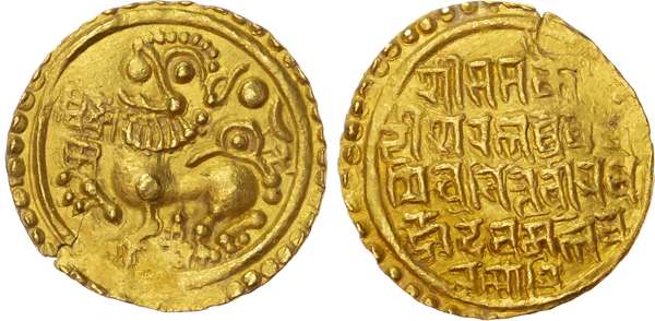 India, Kadambas of Goa, Sivachitta Vajradeva (1215-1225/6 AD), gold Gadyana, bilingual (Kannada and Devanagari), mythical lion (Sardula) with a raised forepaw facing left, sun and crescent above rump, name of cyclic year Vikrama, with swastika in the right field. Rev. Devanagari legend in five lines, 4.41g (Mitch. South I –; Zeno 285526var.). Extremely Fine and extremely rare. Traces of mounting to the bottom of obverse and reverse and a minor flan crack.