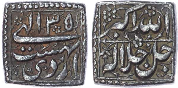 India, Mughal Empire, Akbar (AH 963-1014 / 1556-1605 AD), square Rupee, Ilahi date, IE 35 / 1590-1591 AD, no mint name, 11.38g (KM 90.1). Extremely Fine, deep cabinet tone.