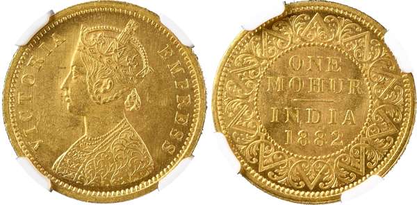 India, EIC, Victoria (1837-1901), gold Mohur, 1882, Calcutta (KM 496; Prid. 14, S&W 6.11). In NGC holder graded MS 62 (8222233-002).