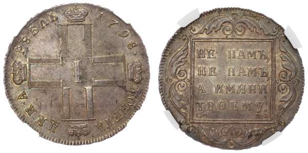 Russia, Paul I (1796-1801), silver Rouble, 1798 CM MБ, St. Petersburg (Bit. 32; Dav. 1688). In NGC holder graded MS 63 (8222655-001). A high quality example from the brief reign of Paul I, a highly sought after design, rare in this quality with a deep cabinet toning.