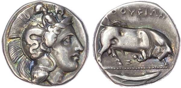 Head of Athena right, wearing a crested and wreathed Attic helmet. Rev. ΘΟΥΡΙΩΝ, bull walking right, fish in exergue. (HN Italy 1800; SNG ANS 1007). Good Very Fine. Portrait of fine style. Pleasing iridescent tone.
