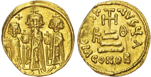 Heraclonas, Heraclius and Heraclius Constantine, all standing facing, each holding a globus cruciger. Rev. VICTORIA-AVϚЧ E, cross potent set on three steps and flanked by symbols, CONOB in exergue. (Sear 770). About Extremely Fine and with remaining lustre. Somewhat weakly struck.