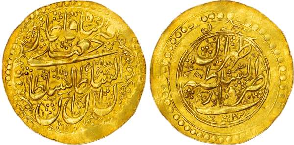 Qajar, Fath Ali Shah (1797-1834), gold Toman, AH 1382 – an incorrect date was engraved onto the die, the date intended was most likely AH 1238, Tehran mint, 4.62g (KM 753). Good Very Fine, slightly wavy flan. An interesting engraver’s error with concerning the date.