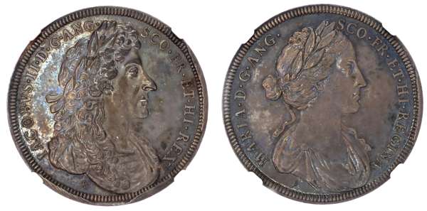 A mule striking of the obverses of the Coronation medal. Laureate and draped bust of James r. rev. Laureate and draped bust of Mary r. (MI 606/8; cf. E 273/2740. Superb mint state, attractively toned with multicolour iridescence, encapsulated by NGC and graded MS 62, very rare mule.