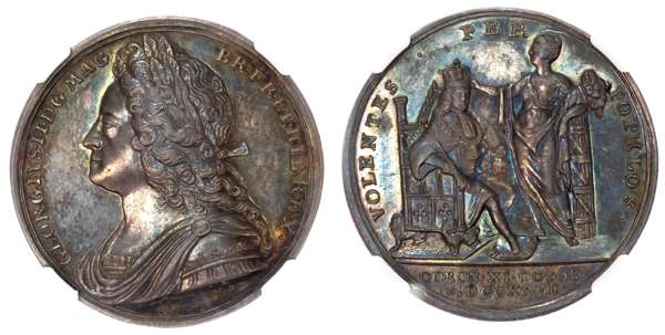 Laureate draped and cuirassed bust left, rev. GEORGE enthroned r., being crowned by Britannia, VOLENTES PEA POPULOS. (MI ii 479/4; E 510; Wollaston 12). Superb mint state, attractively toned with multicolour iridescence, encapsulated by NGC and graded MS 62, rare.
