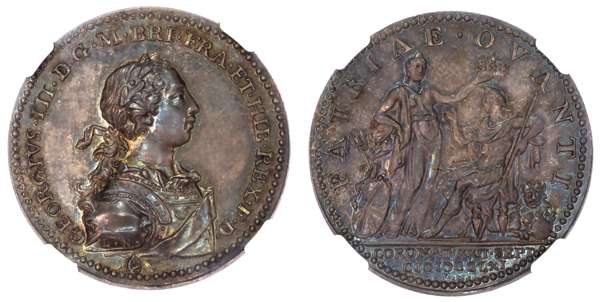 Laureate and armoured bust of George r., plain shoulder, ribbon ties to hair downwards. rev. King, as Roman emperor, enthroned, lion at his side, crowned by Britannia, who faces outwards, PATRIAE OVANTI. (BHM.23; E 694; Woll.xiii c. 18; Nau 154). Superb mint state, attractively toned with multicolour iridescence, encapsulated by NGC and graded MS 63, rare.