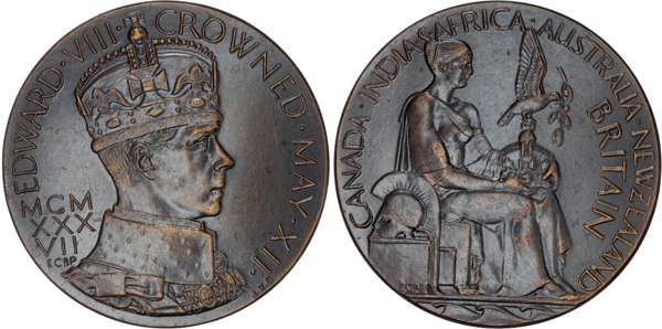 Crowned bust r. in Coronation robes, EDWARD . VIII . CROWNED . MAY . XII. MCMXXXVII, rev. Seated female r. holding Imperial Crown with perched dove holding olive branch in mouth, with Corinthian helmet on pedestal l., CANADA . INDIA . S.AFRICA . AUSTRALIA . NEW ZEALAND, (Giordano CM215a), Extremely Fine or better, toned finish.