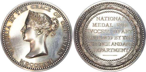 Awarded to Ada Erwood for subject 8D. Crowned bust of young queen l, VICTORIA BY THE GRACE OF GOOD QVEEN MDCCCLVI, rev. Within a laurel and beaded border NATIONAL MEDAL FOR SUCCESS IN ART AWARDED BY THE SCIENCE AND ART DEPARTMENT, (D&W 255/395; E 1511), in original presentation box. Good Extremely Fine, lightly toned, box in excellent condition.