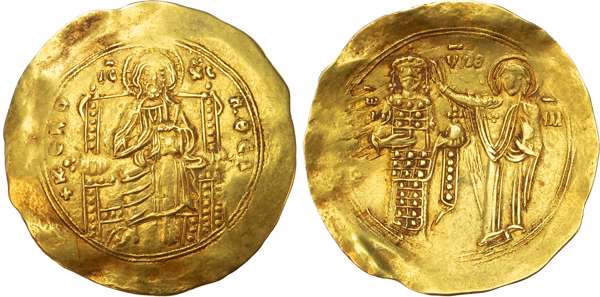 IC-XC, Christ enthroned facing, raising right hand in benediction and holding book of Gospels. Rev. +IѠ ΔЄCΠΟΤΗ, facing, half-length figures of John (left) and the Virgin Mary (right), holding patriarchal cross between them, ΘV-MP to right. (Sear 1938). Good Very Fine. The usual wavy flan.