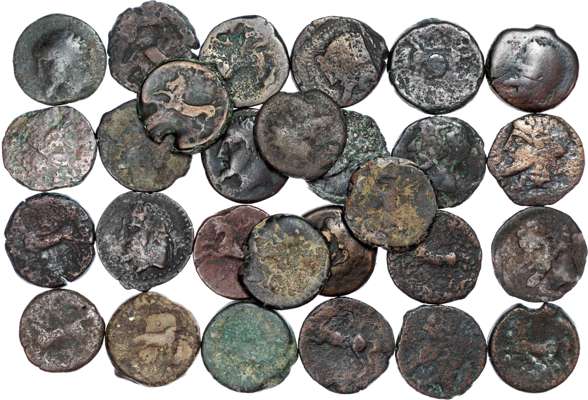 Numidia, Massinissa or Micipsa (c. 203-148 BC or 148-118 BC) Group of 28 AE Units, Varying weights. Laureate male head facing left. Rev. Horse galloping left. (Mazard 45/50; SNG Copenhagen 509). Varying grades. Sold as seen, no returns.