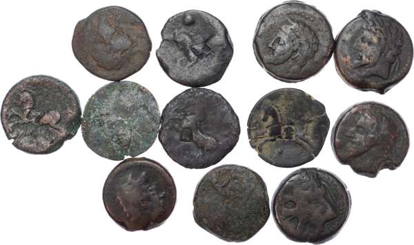 Numidia, Massinissa or Micipsa (c. 203-148 BC or 148-118 BC) Group of 12 Countermarked AE Units, Varying weights. Laureate male head facing left. Rev. Horse galloping left. (Mazard 45/50; SNG Copenhagen 509). Varying grades. Sold as seen, no returns.