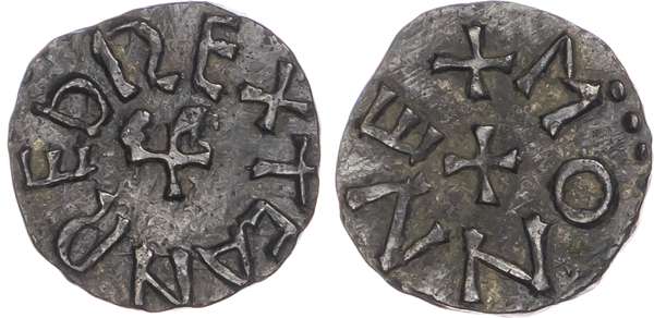 + EANRED REX around central cross pattée, rev. + MONNE around central cross pattée. (Pirie Guide 3.9h; N 186; S 862). Dark green patina, good Very Fine.