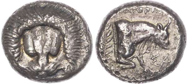 Lion’s scalp facing. Rev. Forepart of ox facing right, ΣΑ below. (Barron Class X, 152; HGC 6, 1218). Good Very Fine. Rare.