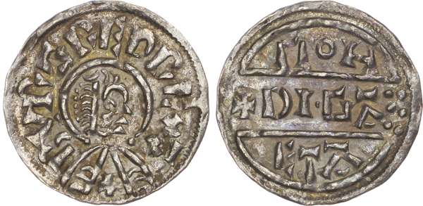 BVRGRED REX, diademed bust right, Rev. MON / +DIGA / ETA, moneyer’s name within two unbroken lunettes, 1.05g/ 12h. (N. 423; S. 939B). Bold Good Very Fine, a pleasing portrait, traces of iridescent toning to reverse.
