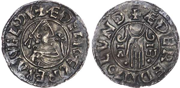 +ÆĐELRED REX ANGLORX, diademed bust right, with sceptre, Rev. +ÆĐERED MO LVND, hand of providence reaching downwards, between alpha and omega, 1.19g/9h. (BMC IId; Hild. B2; N. 768; S. 1146). Almost Extremely Fine, a bold portrait, deeply toned.