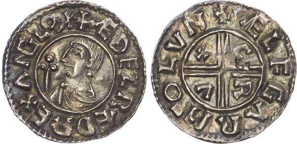 ÆĐELRED REX ANGLORX, bare head left, sceptre in left field, Rev. ÆLFGAR MO LVN, voided short cross, CRVX in angles, 1.62g/6h. (BMC IIIa; Hild. C; N. 770; S. 1148). Extremely Fine, toned.
