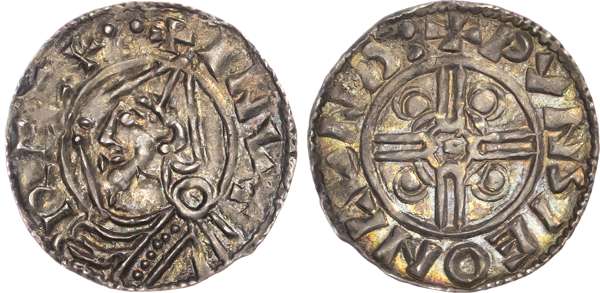 +CNVT RECX∙∙, helmeted bust left, sceptre in left field, Rev. PVNSIE ON LVND:, voided short cross, pellet within annulet in each quarter, pellet within two annulets in centre, 0.96g/12h. (BMC XIV; Hild. G; N. 787; S. 1158). Good Very Fine, lightly toned, attractive iridescent toning.