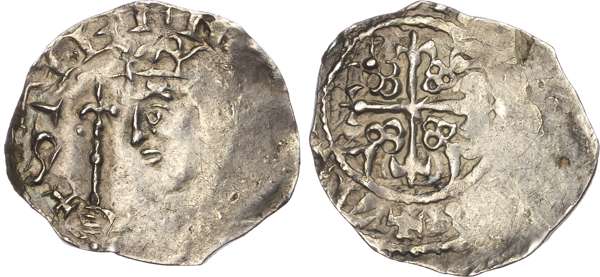 Crowned bust left, holding sceptre in front, rev., cross fleury with a pile surmounted by a trefoil of annulets in each angle, + A[---- -- --]VI. (N 879; S 1281). Irregular flan, very weakly struck on one side and reverse off-centre, but otherwise about Extremely Fine, excellent frontal features of Stephen.