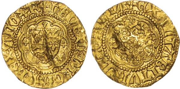 +HENRIC x DI x GRA x REX ANG + F, saltire stops, square-topped shield within a tressure of eight arcs, annulets at cusps, lis above shield, quatrefoil at either side, mullet at 5h, Rev. EXALTABITVR IN GLORIA, double saltire stops, lis in centre of floriate cross, lions, lis, and trefoils in angles within a tressure of eight arcs, 1.69g/8h. (N. 1382; Schnieder 224; S. 1755). About Very Fine, crimped flan with some light scraping to the reverse. A rare type.