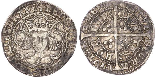 +HENRIC DI GRA REX ANGLIE Z FRANC, crowned bust facing, Rev. POSVI DEVM ADIVTORE MEVM / CIVITAS LONDON, double saltire, annulet stops, long cross pattée, trefoil of pellets in each quarter, annulet in centre of first and third quarters, 3.64g/7h. (N. 1423; S. 1835). Good Fine, reverse better, obverse struck from a rusty die.