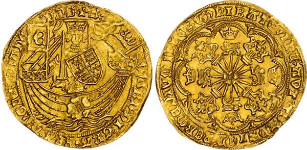 King crowned, standing facing in ship holding sword and shield, rose on hull, flag at stern, rev. rose on radiant sun over floriate cross, crowned leopards in angles, trefoil stops, large fleurs in spandrels, mm. -/crown, 7.71g, (S.1950, N.1549). Good extremely fine, pleasing and well struck.