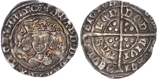 EDWARD’ x DI x GRA’ x REX x ANGL x Z x FRANC, saltire stops, crowned bust facing, quatrefoils by neck, Rev. POSVI DEVM ADIVTORE MEUM / CIVITAS LONDON, long cross pattée, trefoil of pellets in each quarter, extra pellet in fourth quarter, 2.84g/9h. (N. 1568; S. 2000). Good Very Fine, struck on an irregular flan with hints or iridescent pink toning.