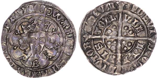 +EDWARD’ DI GRA REX ANGL’ Z FRANC, saltire stops, crowned bust facing B at breast, quatrefoil of pellets at either side of neck, Rev. POSVI DEVM ADIVTORE MEVM / VILLA BRISTOLL, saltire stops, long cross pattée, trefoil of pellets in each quarter, 3g/3h. (N. 1580; S. 2004). Almost Very Fine, ghosting of cross on obverse.