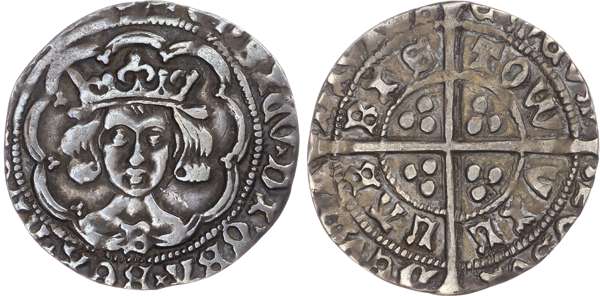 +HENRICV x DI’ GRA x REX x ANG[L Z FRANC], crowned bust facing, B on breast, Rev. POSVI DEVM ADIVTORE MEVM / VILLA BRISTOW, long cross pattée, trefoil of pellets in each quarter, 2.45g/5h. (N. 1619; S. 2083). Good Fine, toned, struck on a small flan. A rare type.