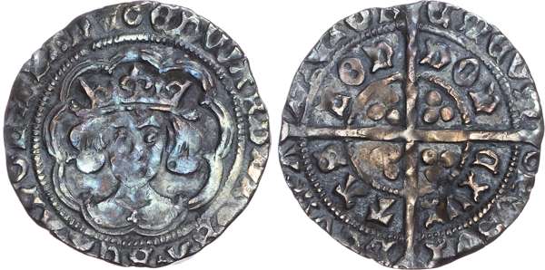 EDWARD DI GRA REX ANGL Z FRANC, crowned bust facing, Rev. POSVI DEVM ADIVTORE MEVM / CIVITAS LONDON, long cross pattée, trefoil of pellets in each quarter, 2.96g/1h. (N. 1631; S. 2096). Good Very Fine, attractive deep blue toning.