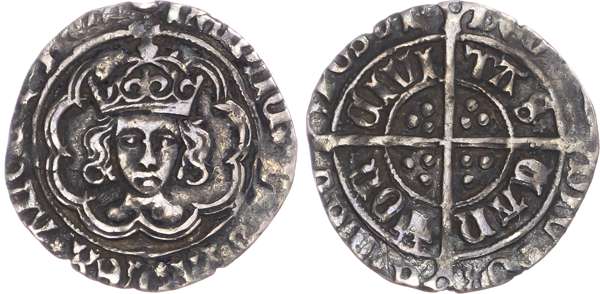 Type IIIb, mm. tun/lis. HENRIC DI GRA REX ANGL Z FRA’, crowned bust facing within tressure of seven arcs, Rev. POSVI DEV ADIVTORE MEV / CIVITAS CANTOR, long cross fourchée, trefoil of pellets in each angle, 1.53g/3h. (N. 1712; S. 2210). Good Very Fine, toned.