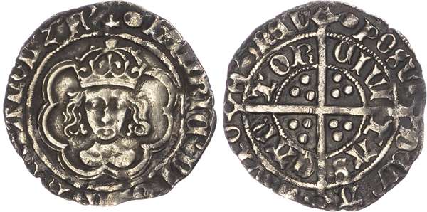 Type IIIc, mm. tun. HENRIC DI GRA REX ANGL Z F, crowned bust facing within tressure of seven arcs, Rev. POSVI DEV ADIVTORE MEV / CIVITAS CANTOR, long cross fourchée, trefoil of pellets in each angle, 1.24g/3h. (N. 1712; S. 2211). Good Very Fine, toned.