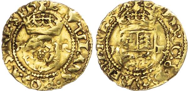 Southwark mint, mm. E, transposed legends. H R RVIELANS ROSA SINE SP, crowned rose, H R at either side, Rev. HENRIC 8 D G’ A FR Z HIB REX, crowned shield, H R at either side, 1.59g. (N. 1870; S. 2400) Near Very Fine with some weakness and creased in the past. A rare issue.