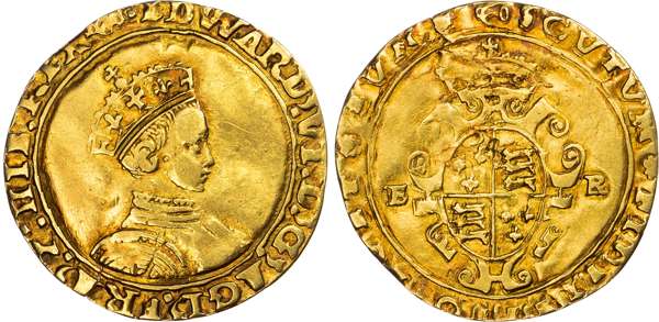 Struck in crown gold of 22 carat with a nominal value of 10s, mintmark grapple (1549) both sides, Southwark Mint. Crowned, cuirassed bust r. rev. Crowned Royal Arms, in ogee garnishing, dividing E and R, SCVTVM FIDEI PROTEGET EVM, (N. 1911; Schneider 681; S.2438). Lightly toned, good Very Fine. A fundamentally sound example of the denomination with a scarcer mintmark.