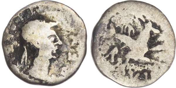 Kings of Mauretania, Ptolemy (c. AD 20/1-40) AR Denarius, mint of Caesarea, dated RY 6 (c. AD 25/6 or 26/7), 1.57g. REX PTOLEMAEVS, diademed and draped bust of Ptolemy facing right. Rev. Capricorn right, cornucopiae behind, RA VI below. (Mazard 453; SNG Copenhagen -). Fair. Extremely Rare. Only one other on CoinArchives.
