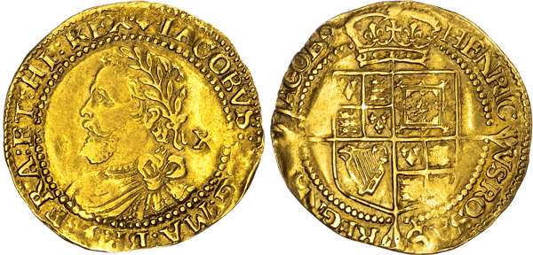 ·IACOBVS·D·G·MA·BRI·FRA·ET·HI·REX·, crowned fourth bust left, X behind head, Rev. HENRICVS ROSAS REGNA IACO⁹, long cross fleury over crowned square-topped shield, 4.43g/12h. (N. 2117; S. 2641A). Very Fine, well struck.