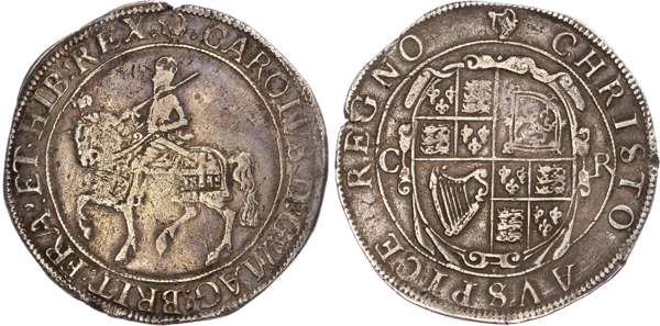 Second style horseman, type 2a, - smaller horse. King mounted l. with sword over shoulder, cross on housings, rev. Oval Royal Arms, C R above. (Brooker 300; N 2205; S 2769). About Very Fine, rev. better.
