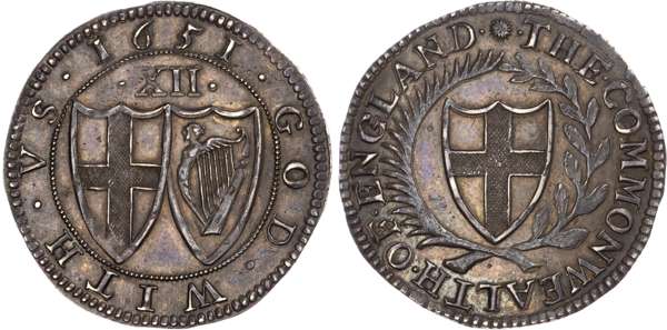 6.08g. Tower mint, im: sun/-. Dated 1651. (sun) Coat-of-arms within wreath, · THE · COMMONWEALTH · OF · ENGLAND ·. Rev, coats-of-arms bearing St. George's Cross and Irish harp, · GOD · WITH · VS · 1651 ·, ·XII· (mark of value) above. (ESC 983; North 2724; S.3217). Choice about as struck. Proof like fields, delightfully toned. A quintessential example of the Commonwealth fine work series. Very rare, seldom seen on the open market with an illustrious and sequential provenance dating back to the mid 19th century.